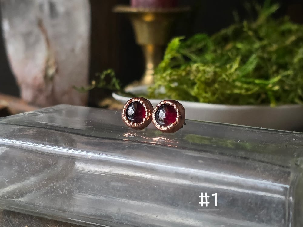 Garnet Stud Earrings, electroformed copper.